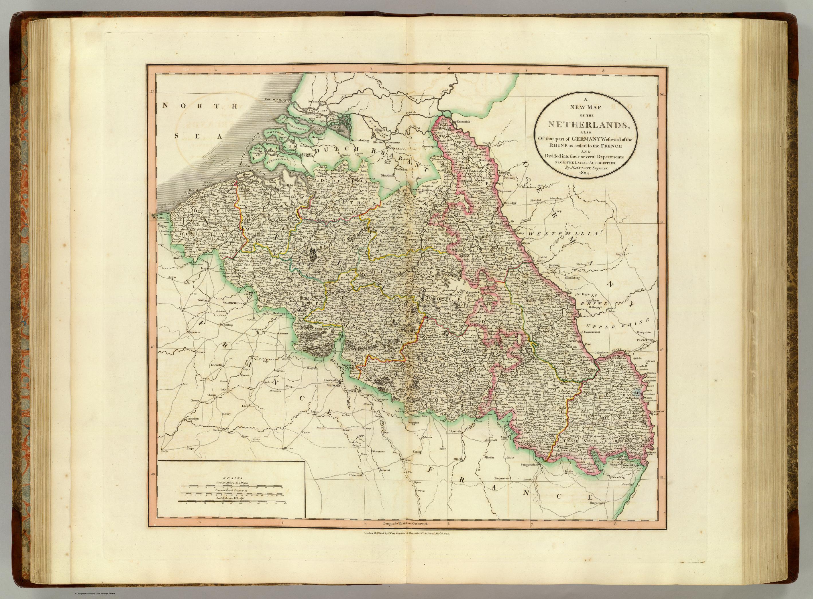 John Cary was a well known, well respected, and well-trusted cartographer in Britain in the later 18th century and early 19th century. In this map which he produced in 1804, he produces an extremely detailed map of the Netherlands and Northern France focussing on the Netherlands. Like the other British maps, Cary acknowledges territory that would become Belgium as separate from France. However, this map does not take objection to all of France's territorial gains during the Revolutionary/Napoleonic Era. The title of the map reads "New Map of the Netherlands also of that Part of Germany Westward of the Rhine as Ceded to the French and Divided Into Several Departments." This map was created two years after an initial peace treaty, the Treaty of Amiens, was signed between France and Britain, but yet Britain did not officially recognize the territory of Belgium as part of France by the terms of the treaty. It would be beneficial to know how tied to the government the authority patronizing the creation of this map was, so it could be determined if this was an active attempt by the British government to keep French possession of Belgium out of public conscienceness or if this map is a more natural reflection of British public conception of this territory.