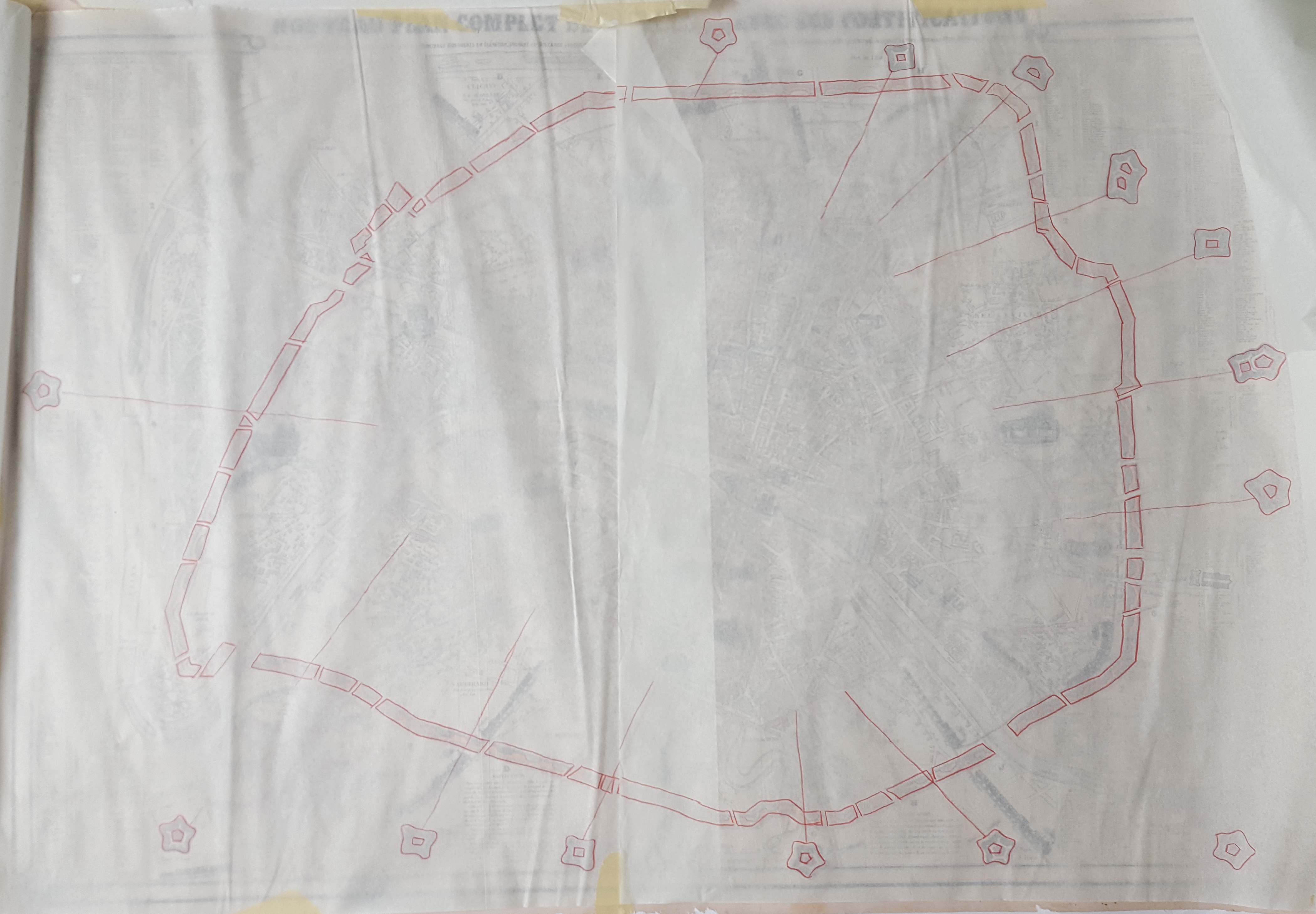 The map takes great care to pick out Paris’ fortifications. The Murs d’Enceinte, walls built in the 1840s around Paris are highlighted in orange, and forts in the Paris region, which would not fit onto the map, are included with lines indicating truncated distances. While I could find one other civilian map of Paris that similarly emphasised fortifications, the only other ones to do so are military maps. Furthermore, the Murs d’Enceinte were unpopular in Paris, as it was suspected they had been built to hem Paris in rather than to defend it. This layer is interesting when considered in relation to the railways and monuments, and the political developments in France at the time: the map was published three years after the establishment of the Second Empire, which used the memory of Napoleonic military glory to legitimise itself. In elevating Paris’ military fixtures to the level of public monuments, this map seems to be making (or perhaps accepting or reflecting) an argument for the importance of the military to Paris and to France.